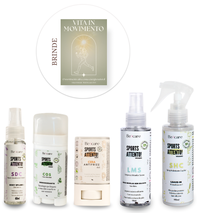 O kit acompanha um livrinho exclusivo Beccare, que guia você por um ritual prático, energizante e natural — unindo respiração, movimento consciente, hidratação e autocuidado para que seu corpo e sua pele acompanhem a força da sua rotina. É o seu lembrete diário de que movimento também é cuidado.